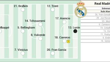 Lunin, Trent, Asencio, Carreras, Fran Garcia, Valverde, Tchouameni, Bellingham, Vinicius, Brahim Diaz, Mbappe.