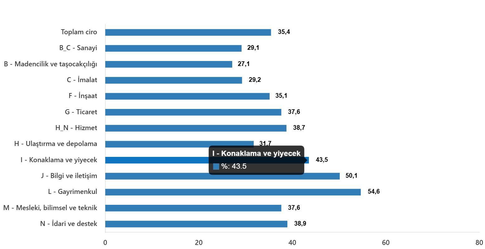 Toplam cironun alt ayrıntılarına bakıldığında; 2025 yılı Ekim ayında yıllık sanayi kesimi ciro endeksi %29,1 arttı, inşaat ciro endeksi %35,1 arttı, ticaret ciro endeksi %37,6 arttı, hizmet ciro endeksi %38,7 arttı.