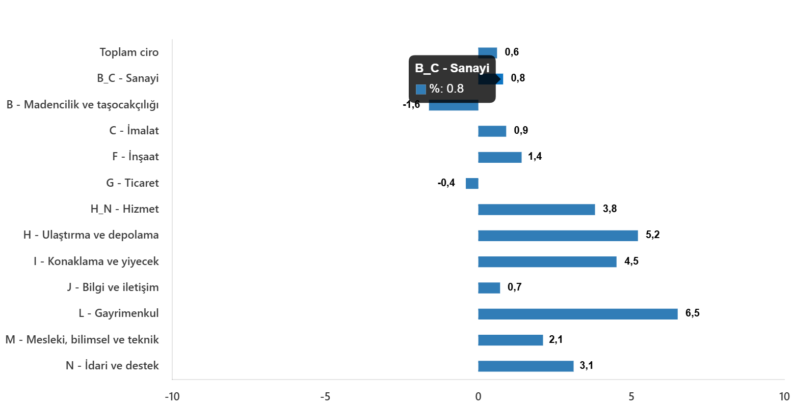 Toplam cironun alt ayrıntılarına bakıldığında; 2025 yılı Ekim ayında aylık sanayi bölümü ciro endeksi %0,8 arttı, inşaat ciro endeksi %1,4 arttı, ticaret ciro endeksi %0,4 azaldı, hizmet ciro endeksi %3,8 arttı.