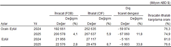 Ocak-Eylül periyodunda dış ticaret açığı %11,8 artarak 59 milyar 974 milyon dolardan, 67 milyar 60 milyon dolara yükseldi. İhracatın ithalatı karşılama oranı 2024 Ocak-Eylül devrinde %76,3 iken, 2025 yılının tıpkı devrinde %74,9’a geriledi.