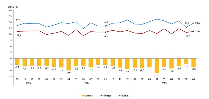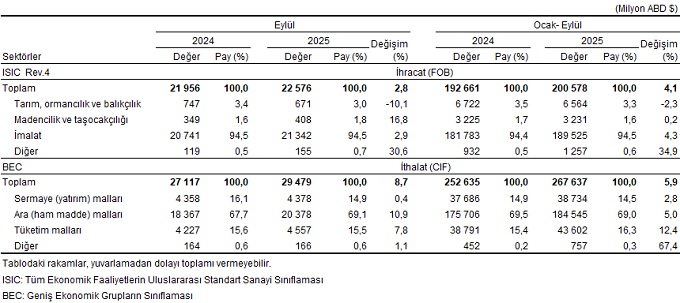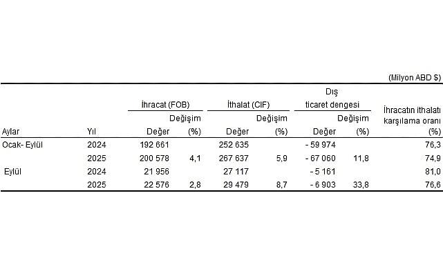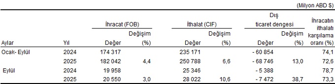 Türkiye İstatistik Kurumu ile Ticaret Bakanlığı iş birliğiyle genel ticaret sistemi kapsamında üretilen süreksiz dış ticaret bilgilerine nazaran; ihracat 2025 yılı Eylül ayında, bir evvelki yılın birebir ayına nazaran %2,8 artarak 22 milyar 576 milyon dolar, ithalat %8,7 artarak 29 milyar 479 milyon dolar olarak gerçekleşti.