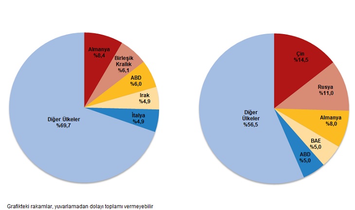 İthalatta Çin birinci sırayı aldı. Eylül ayında Çin’den yapılan ithalat 4 milyar 264 milyon dolar olurken, bu ülkeyi sırasıyla; 3 milyar 247 milyon dolar ile Rusya Federasyonu, 2 milyar 363 milyon dolar ile Almanya, 1 milyar 485 milyon dolar ile Birleşik Arap Emirlikleri, 1 milyar 465 milyon dolar ile ABD izledi. Birinci 5 ülkeden yapılan ithalat, toplam ithalatın %43,5’ini oluşturdu.