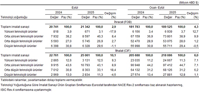 Teknoloji yoğunluğuna nazaran imalat sanayi eserleri dış ticareti, Eylül 2025
