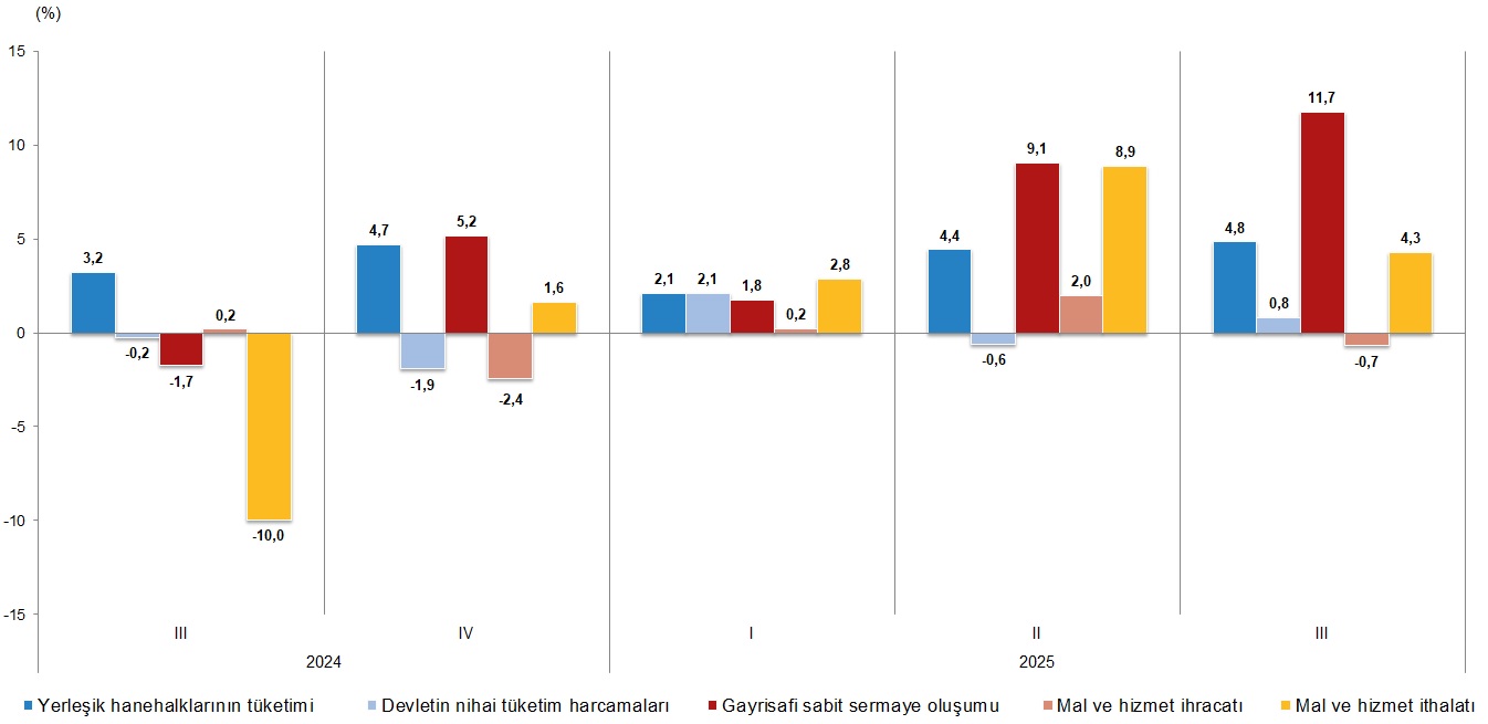 Yerleşik hanehalklarının en son tüketim harcamaları 2025 yılının üçüncü çeyreğinde bir evvelki yılın tıpkı çeyreğine nazaran zincirlenmiş hacim endeksi olarak %4,8 arttı. Devletin son tüketim harcamaları %0,8, gayrisafi sabit sermaye oluşumu ise %11,7 arttı.