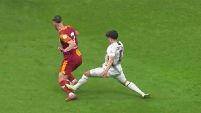 Bahattin Duran: ‘Burada topu uzaklaştırdıktan sonra kayarak elle oynuyor. Konum ceza alanı dışında olduğu için penaltı değil. Ceza alanı içinde olsa da penaltı verilmezdi.’Bülent Yıldırım: ‘Kesinlikle bir penaltı yok.’