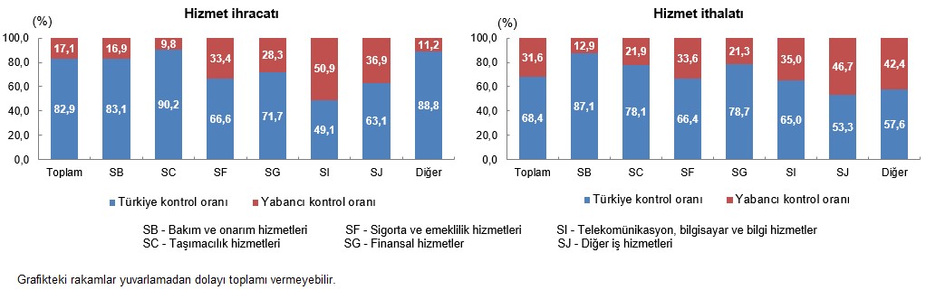 Hizmet ticaretinde en yüksek hisseye sahip olan nakliyat hizmetlerinde yapılan ihracatın %90,2’si, ithalatın ise %78,1’i Türkiye denetimindeki teşebbüsler tarafından gerçekleştirildi. Telekomünikasyon, bilgisayar ve bilgi hizmetleri ihracatında Türkiye denetimli teşebbüslerin hissesi %49,1 iken yabancı denetimli teşebbüslerin hissesi %50,9 oldu. Sigorta ve emeklilik hizmetleri ihracatının %33,4’ü ve ithalatının %33,6’sı yabancı denetimli teşebbüsler tarafından yapıldı. Finansal hizmetlerde ihracatın %71,7’sini, ithalatın ise %78,7’sini Türkiye denetimli teşebbüsler gerçekleştirdi.