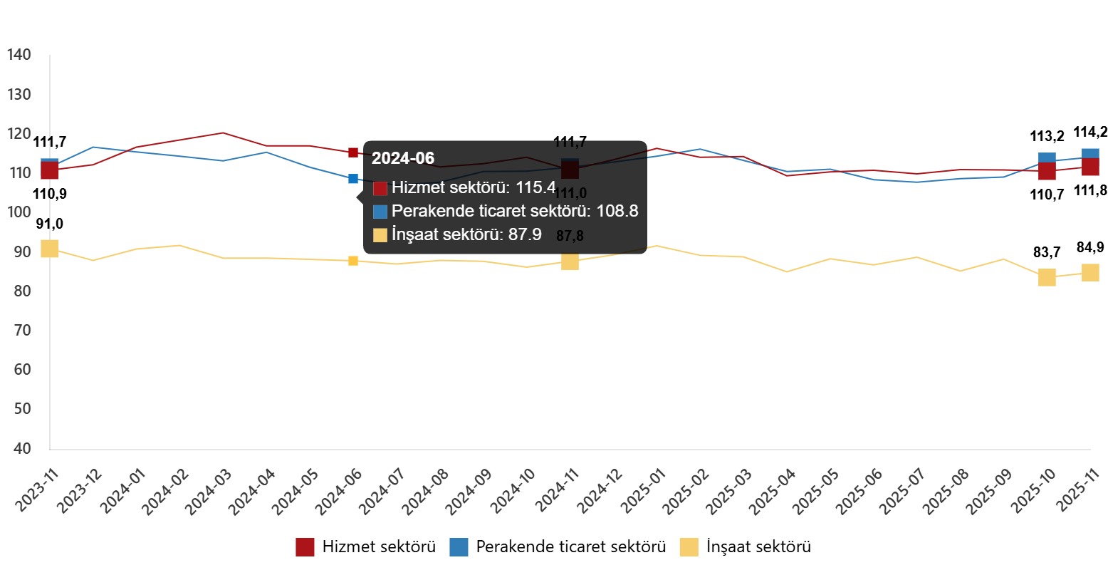 Mevsim tesirlerinden arındırılmış inanç endeksi Kasım ayında bir evvelki aya nazaran; hizmet bölümünde %1,0 oranında artarak 111,8 kıymetini, perakende ticaret kesiminde %0,9 oranında artarak 114,2 bedelini ve inşaat kesiminde %1,5 oranında artarak 84,9 bedelini aldı.