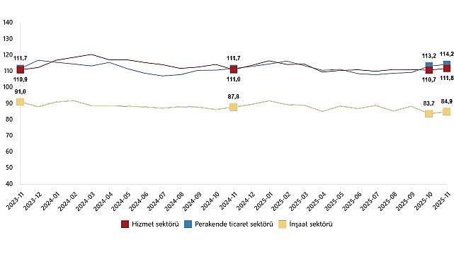 Mevsim tesirlerinden arındırılmış inanç endeksi Kasım ayında bir evvelki aya nazaran; hizmet bölümünde %1,0 oranında artarak 111,8 kıymetini, perakende ticaret kesiminde %0,9 oranında artarak 114,2 bedelini ve inşaat kesiminde %1,5 oranında artarak 84,9 bedelini aldı.