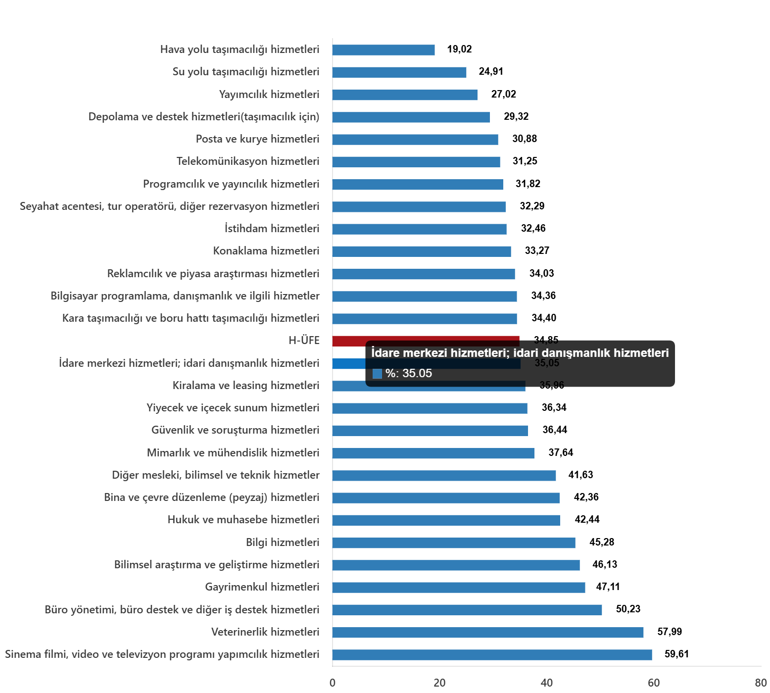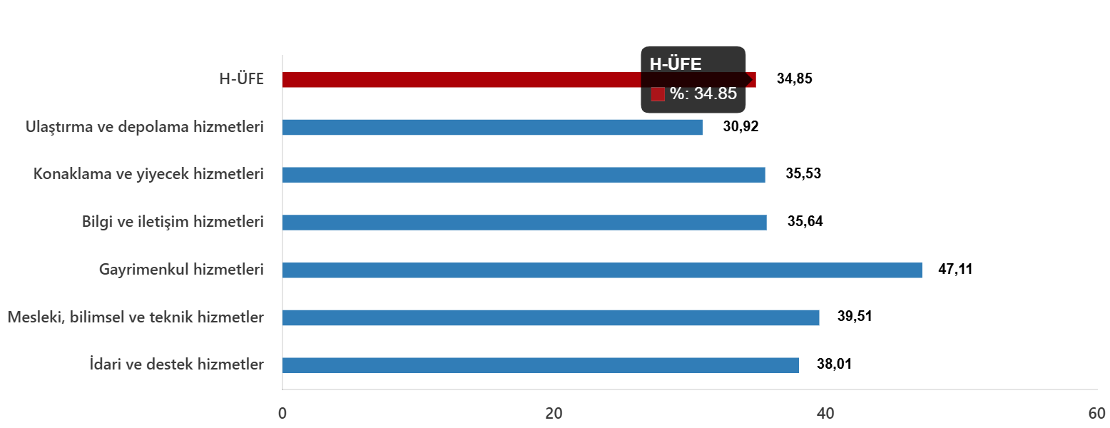 Bir evvelki yılın birebir ayına nazaran, ulaştırma ve depolama hizmetlerinde %30,92 artış, konaklama ve yiyecek hizmetlerinde %35,53 artış, bilgi ve bağlantı hizmetlerinde %35,64 artış, gayrimenkul hizmetlerinde %47,11 artış, mesleksel, bilimsel ve teknik hizmetlerde %39,51 artış, idari ve dayanak hizmetlerde %38,01 artış gerçekleşti.