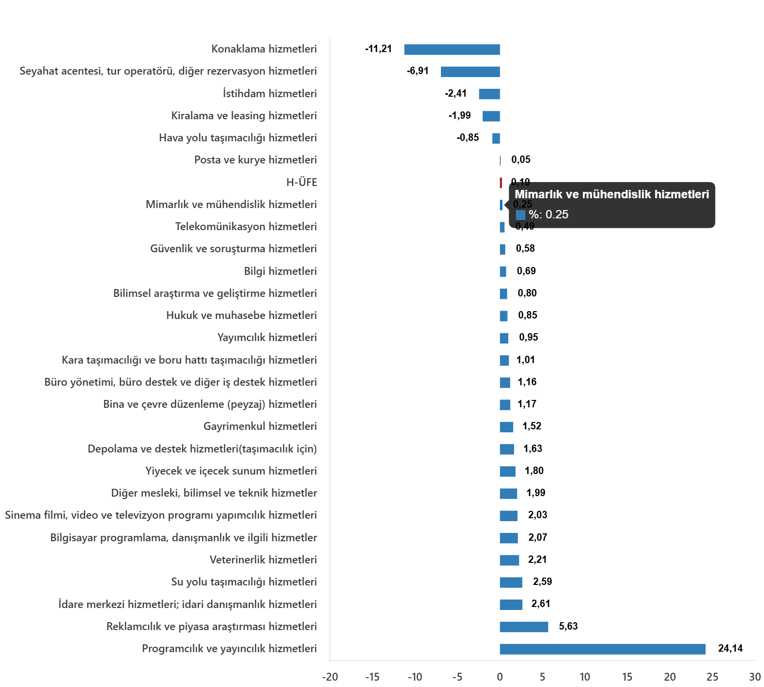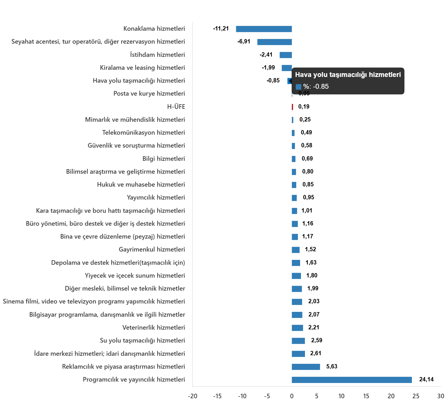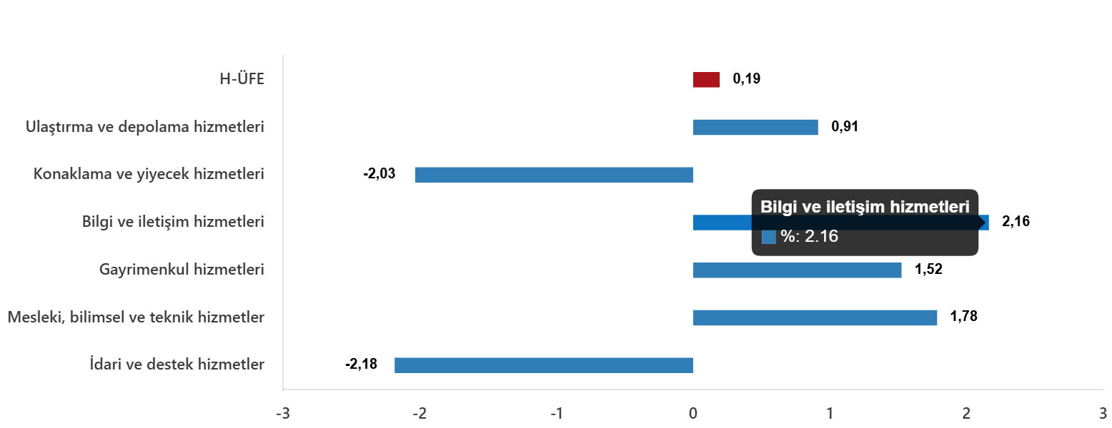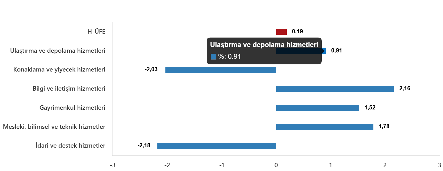 Bir evvelki aya nazaran, ulaştırma ve depolama hizmetlerinde %0,91 artış, konaklama ve yiyecek hizmetlerinde %2,03 azalış, bilgi ve bağlantı hizmetlerinde %2,16 artış, gayrimenkul hizmetlerinde %1,52 artış, mesleksel, bilimsel ve teknik hizmetlerde %1,78 artış, idari ve takviye hizmetlerde %2,18 azalış gerçekleşti.