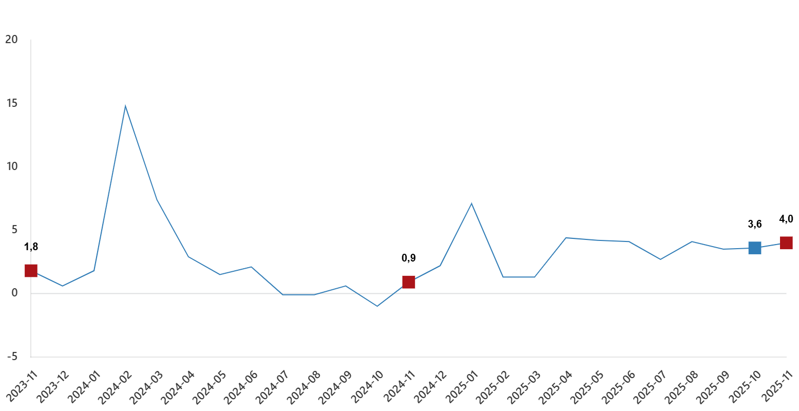 Hizmet üretim endeksi (2021=100) 2025 yılı Kasım ayında bir evvelki yılın tıpkı ayına nazaran %4,0 arttı. Tıpkı ayda ulaştırma ve depolama hizmetleri %1,6 arttı, konaklama ve yiyecek hizmetleri %7,2 arttı, bilgi ve bağlantı hizmetleri %8,7 arttı, gayrimenkul hizmetleri %3,0 arttı, mesleksel, bilimsel ve teknik hizmetler %1,7 arttı, idari ve takviye hizmetleri ise %5,1 arttı.
