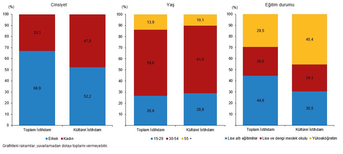 Kültürel istihdam 2024 yılında bir evvelki yıla nazaran %6,5 artarak 957 bin kişi oldu ve kültürel istihdamın toplam istihdam içindeki hissesi %2,9 oldu. Kültürel istihdamda olanların %52,2’sini erkekler, %47,8’ini bayanlar oluşturdu. Kültürel istihdamdakilerin %45,4’ü yükseköğretim mezunlarından, %30,5’i lise altı eğitimlilerden ve %24,1’i lise ve dengi meslek okulu mezunlarından oluştu.