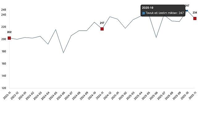 Bir evvelki ay 247 bin 392 ton olan tavuk eti üretimi Kasım ayında %5,5 oranında azalarak 233 bin 887 ton oldu.