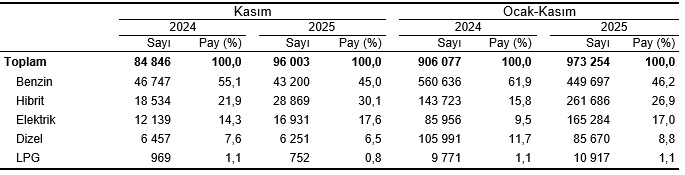Trafiğe kaydı yapılan arabaların yakıt cinslerine nazaran dağılımı, Kasım 2025