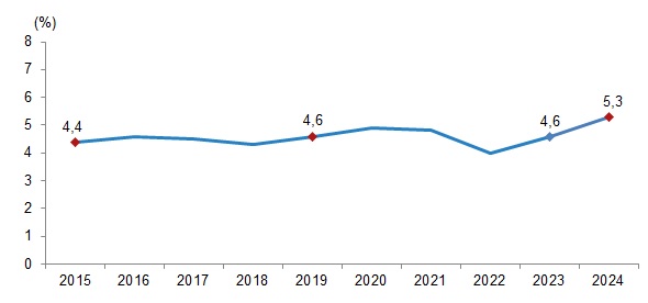 Toplam sıhhat harcamasının GSYH’ye oranı 2023 yılında %4,6 iken, 2024 yılında %5,3 oldu. Cari sıhhat harcamasının GSYH’ye oranı 2023 yılında %4,2, 2024 yılında %4,9 olarak hesaplandı.