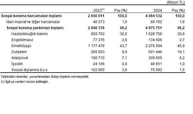 Sosyal müdafaa harcamalarının gayrisafi yurt içi hasıla (GSYH) içindeki hissesi 2024 yılında %11,1 oldu. Toplumsal muhafaza yardımlarının GSYH içindeki hissesi ise %10,9 olarak gerçekleşti. Risk/ihtiyaç kümeleri bazında bakıldığında, emekli/yaşlılara yapılan harcamaların %5,1 ile en büyük hisseye sahip olduğu görüldü. Bunu, %3,4 ile hastalık/sağlık bakımı harcamaları ve %1,1 ile dul/yetim harcamaları takip etti.