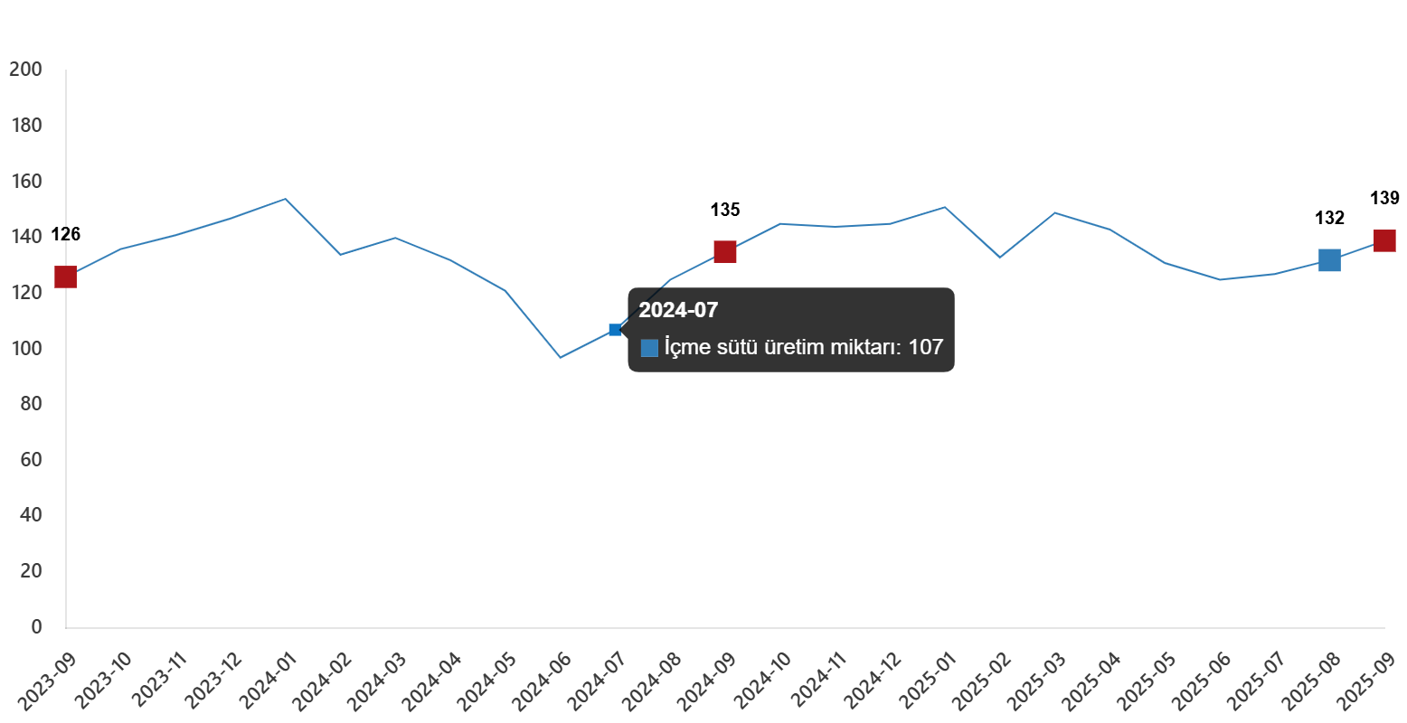 Bir evvelki ay 132 bin 359 ton olan içme sütü üretimi Eylül ayında %4,8 oranında artarak 138 bin 726 ton olarak gerçekleşti.