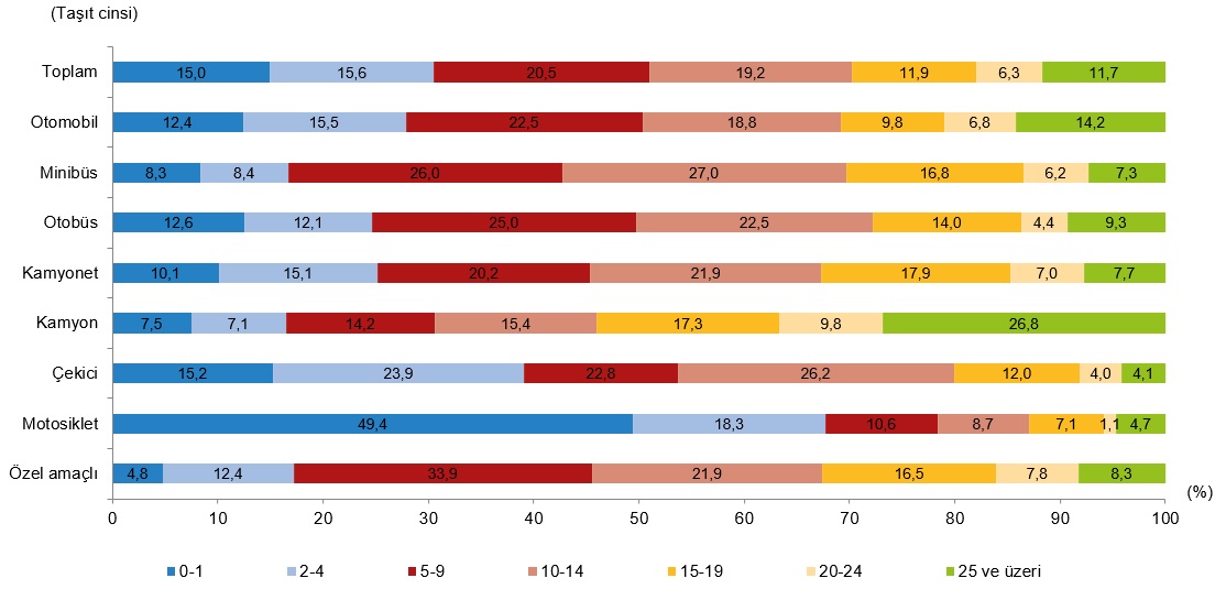 Türkiye’de 2024 yılında katedilen toplam ara taşıtların yaş kümelerine nazaran incelendiğinde; en fazla yol %20,5’lik oranla taşıt filosunun %16,8’ini oluşturan 5-9 yaş kümesi taşıtlar tarafından yapılırken, bunu sırasıyla %19,2 ile 10-14 yaş, %15,6 ile 2-4 yaş, %15,0 ile 0-1 yaş, %11,9 ile 15-19 yaş, %11,7 ile 25 yaş ve üzeri ve %6,3 ile 20-24 yaş kümesi taşıtlar takip etti. Bu oran arabalarda 5-9 yaş arabalar için %22,5, 10-14 yaş için %18,8, 2-4 yaş için %15,5, 25 yaş ve üzeri için %14,2, 0-1 yaş için %12,4, 15-19 yaş için %9,8 ve 20-24 yaş için ise %6,8 oldu.