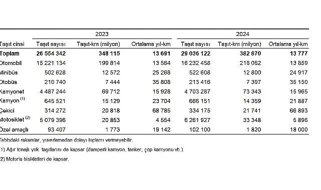 Taşıtların bir yılda yaptıkları ortalama kilometreler incelendiğinde; 2024 yılında sırasıyla çekicilerin 66 bin 893, otobüslerin 35 bin 150, minibüslerin 24 bin 917, kamyonların 21 bin 887, özel gayeli taşıtların 18 bin, kamyonetlerin 15 bin 965, arabaların 13 bin 859 ve motosikletlerin 5 bin 896 kilometre yaptığı hesaplandı.