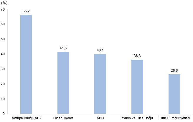İhracat yapan teknogirişimlerin %66,2’si AB ülkelerine, %41,5’i başka ülkelere, %40,1’i ABD’ye, %36,3’ü Yakın ve Orta Doğu ülkelerine ve %26,6’sı Türk Cumhuriyetleri’ne ihracat gerçekleştirdi.