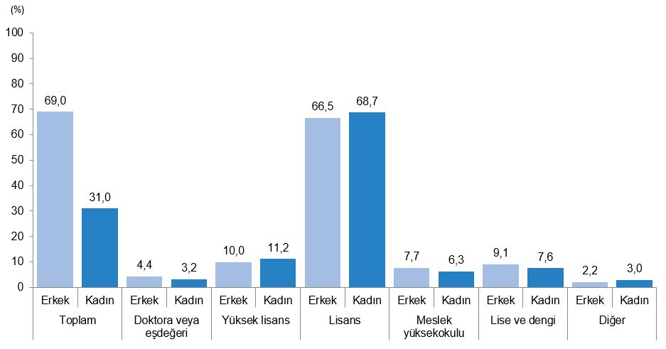 Kadın işçide ise en yüksek hisse yeniden lisans mezunlarına ilişkin olup, bu oran %68,7’dir. Bayan çalışanlarda yüksek lisans mezunları %11,2 ile ikinci sırada yer almakta, bunu lise ve dengi (%7,6), meslek yüksekokulu (%6,3), doktora yahut muadili (%3,2) ve öteki (%3,0) takip etmektedir.
