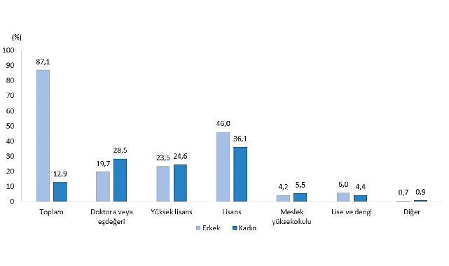 Kadınlarda ise en yüksek hisse lisans mezunlarında (%36,1) olup, bunu doktora yahut muadili (%28,5) ve yüksek lisans (%24,6) takip etmektedir.