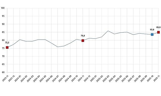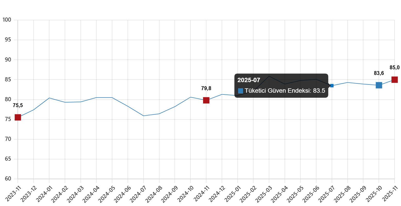 Türkiye İstatistik Kurumu ve Türkiye Cumhuriyet Merkez Bankası işbirliği ile yürütülen tüketici eğilim anketi sonuçlarından hesaplanan tüketici itimat endeksi, Ekim ayında 83,6 iken Kasım ayında %1,6 oranında artarak 85,0 oldu.